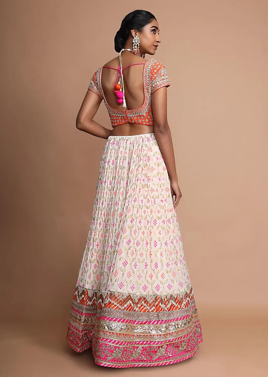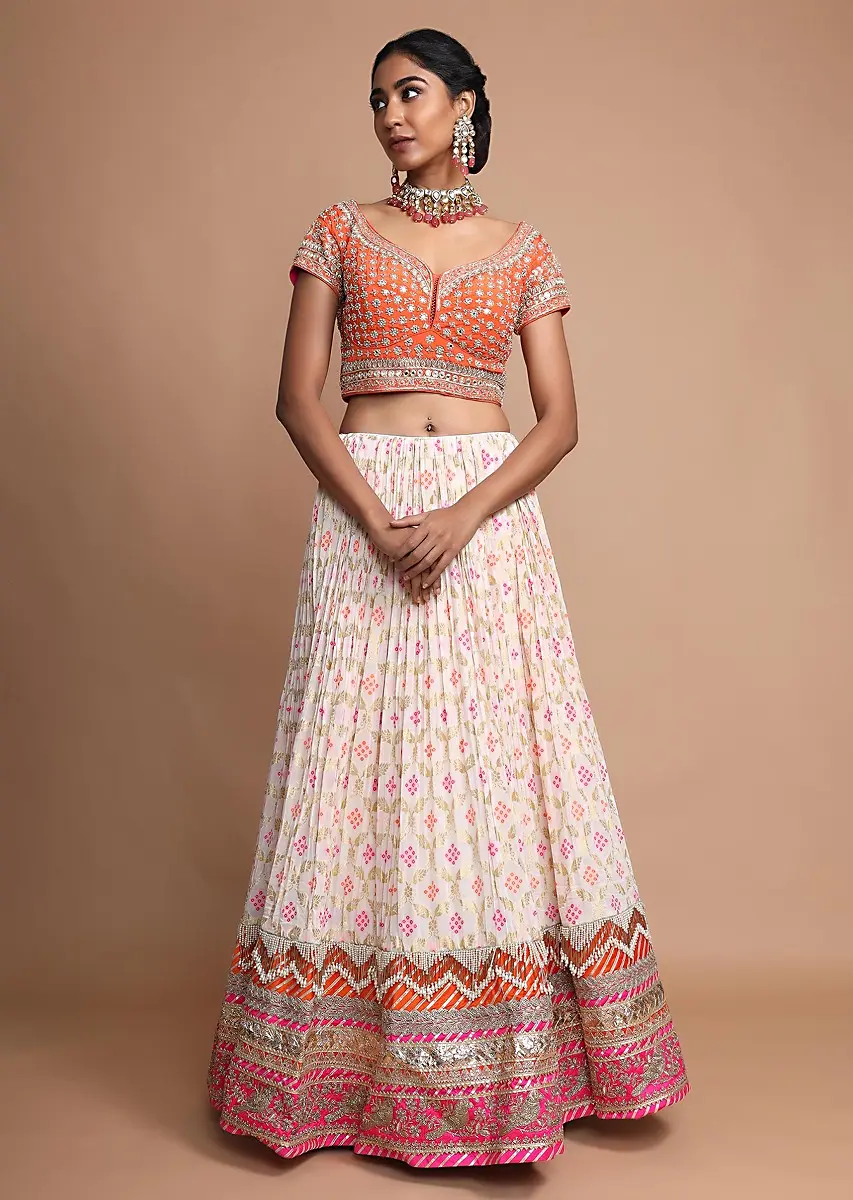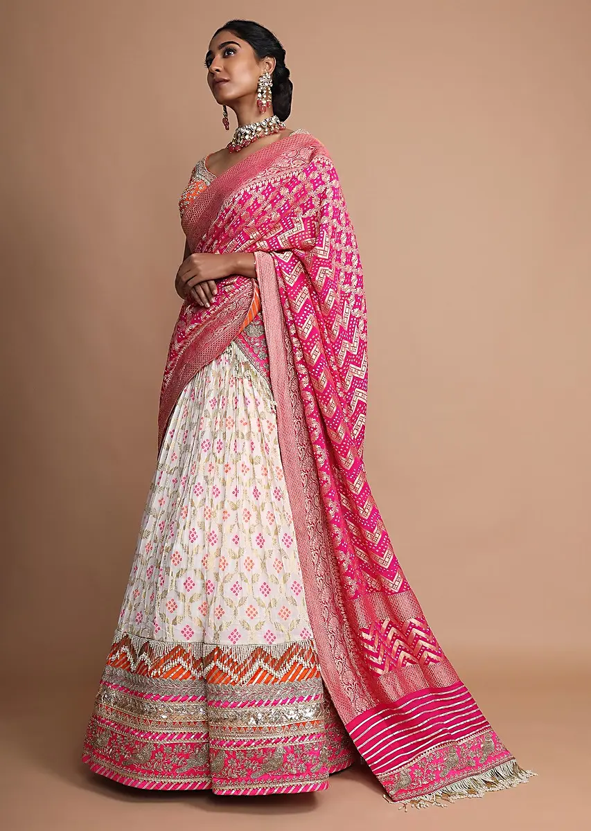 - Off white lehenga in georgette with bandhani print and weaved moroccan design.