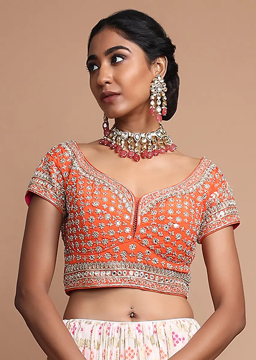 - Paired with an orange blouse with heavy zari, zardozi and french knot embroidered buttis.