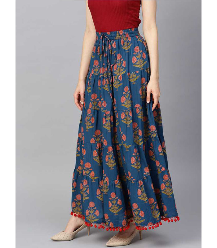 blue floral printed tiered skirt with drawstring and tassels at waist band with pom-pom lace at hemline, all over elasticated waist band with dori and tassel detailing